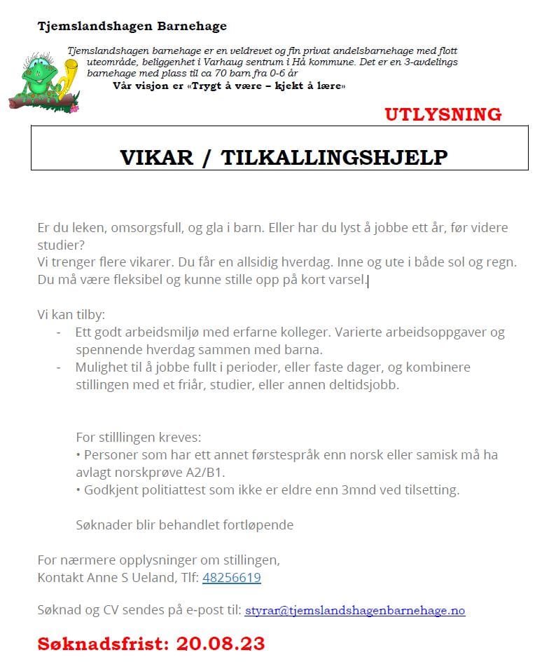 Vi trenger flere ringevikarer Postet på 7. august 20237. august 2023 av Tjemslandshagen barnehage Tjemslandshagen-Barnehage-informasjonLast ned